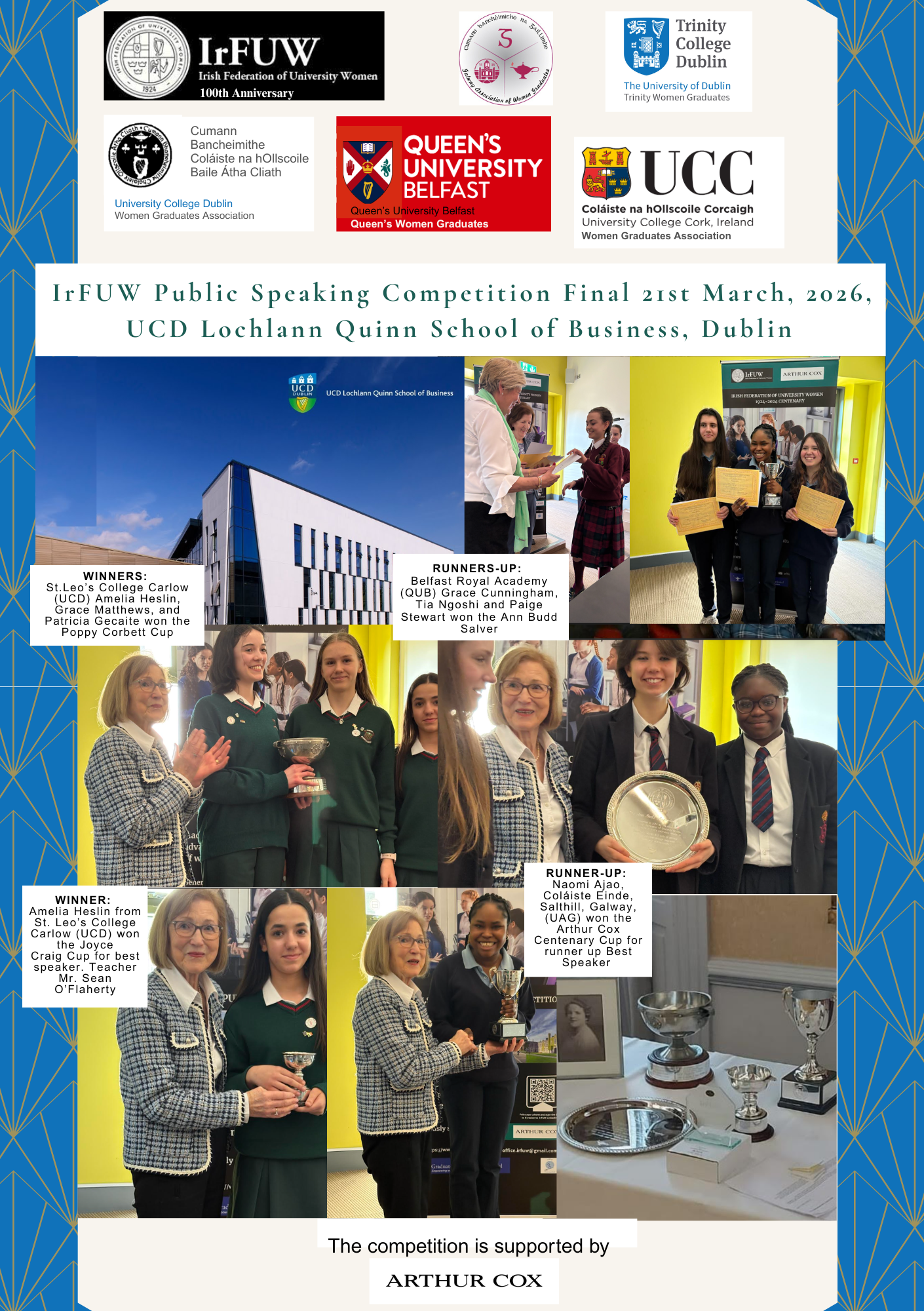 Arthur Cox LLP the competition's main sponsor states that “We are proud to support the competition and would like to send huge congratulations to the finalists and winners this year.” The IrFUW is deeply grateful to all participating associations, organisers, and to Arthur Cox LLP for their continued sponsorship in empowering the next generation.